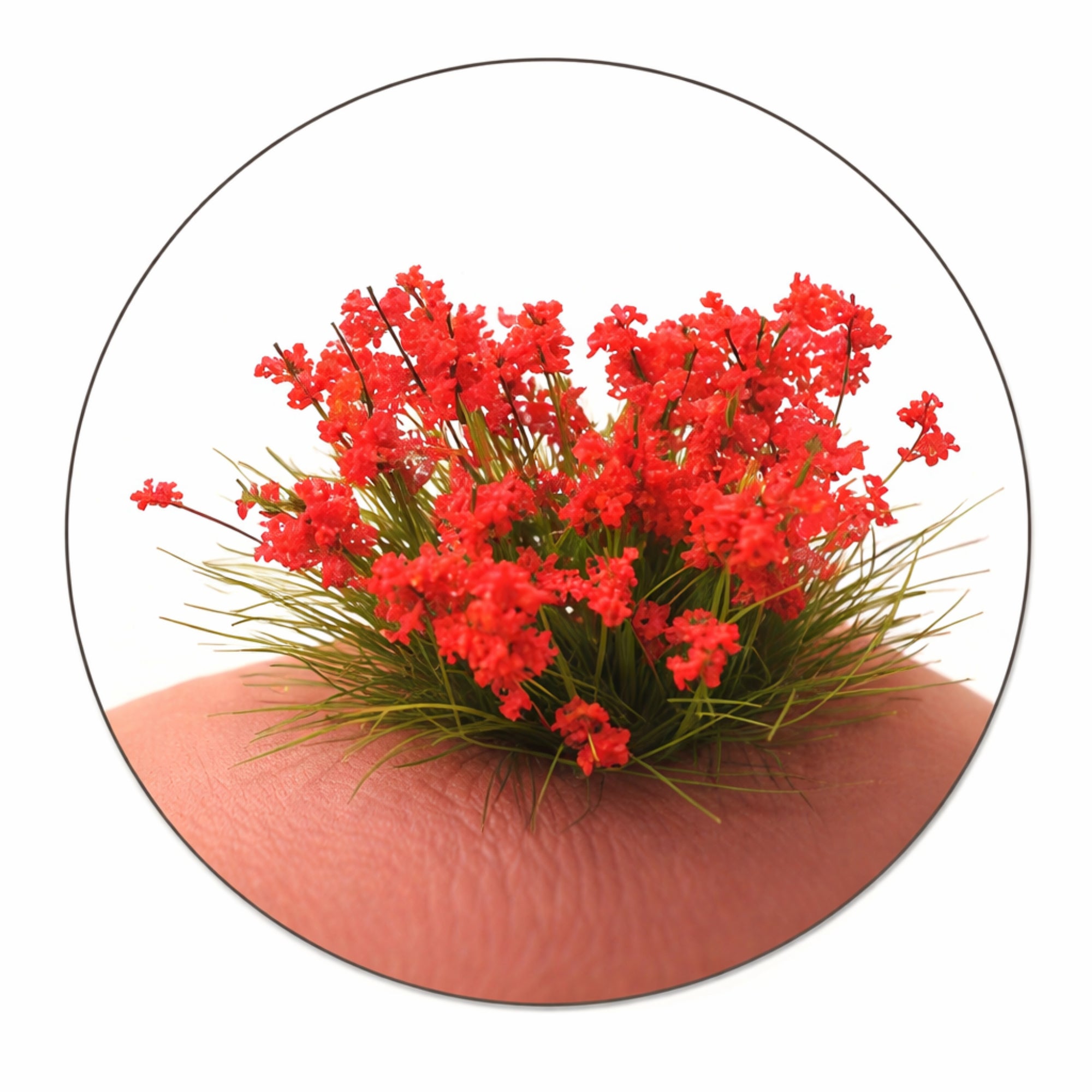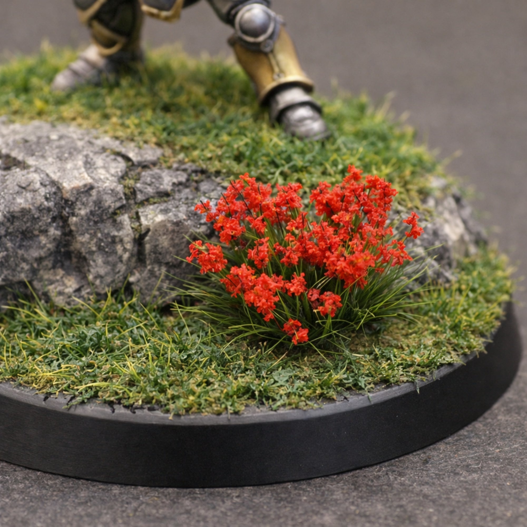 Kępki kwiatów modelarskich sprawdzają się w różnych typach dioram i podstawek, niezależnie od stylu sceny czy skali projektu. Dzięki neutralnej formie i wyraźnemu detalowi mogą być wykorzystywane zarówno w sceneriach fantasy, realistycznych makietach terenowych, jak i na podstawkach pod figurki do gier bitewnych.