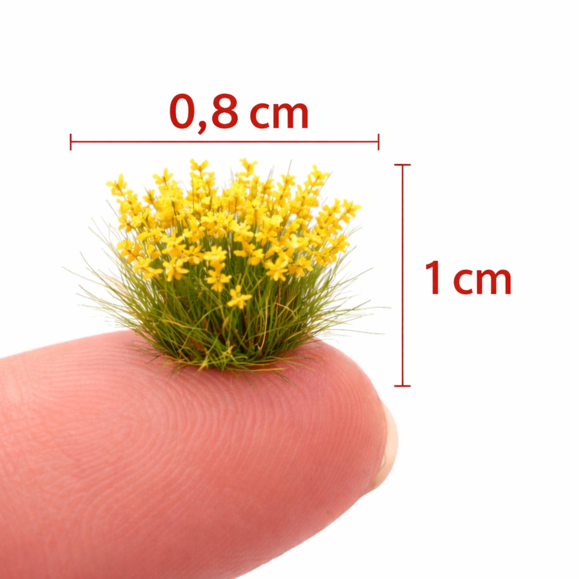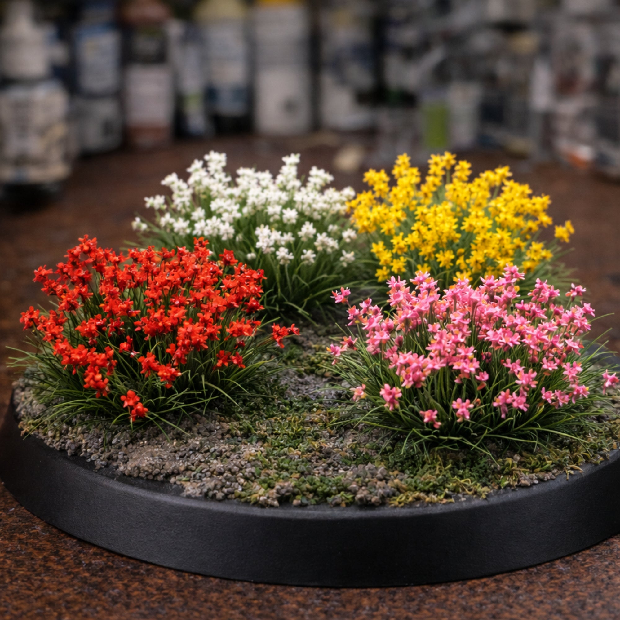 Zestaw modelarskich kępek kwiatów przeznaczonych do dekoracji dioram, podstawek pod figurki oraz elementów terenowych. Niewielkie rozmiary kępek sprawiają, że doskonale sprawdzają się przy budowie realistycznej roślinności w skali modeli i miniatur.